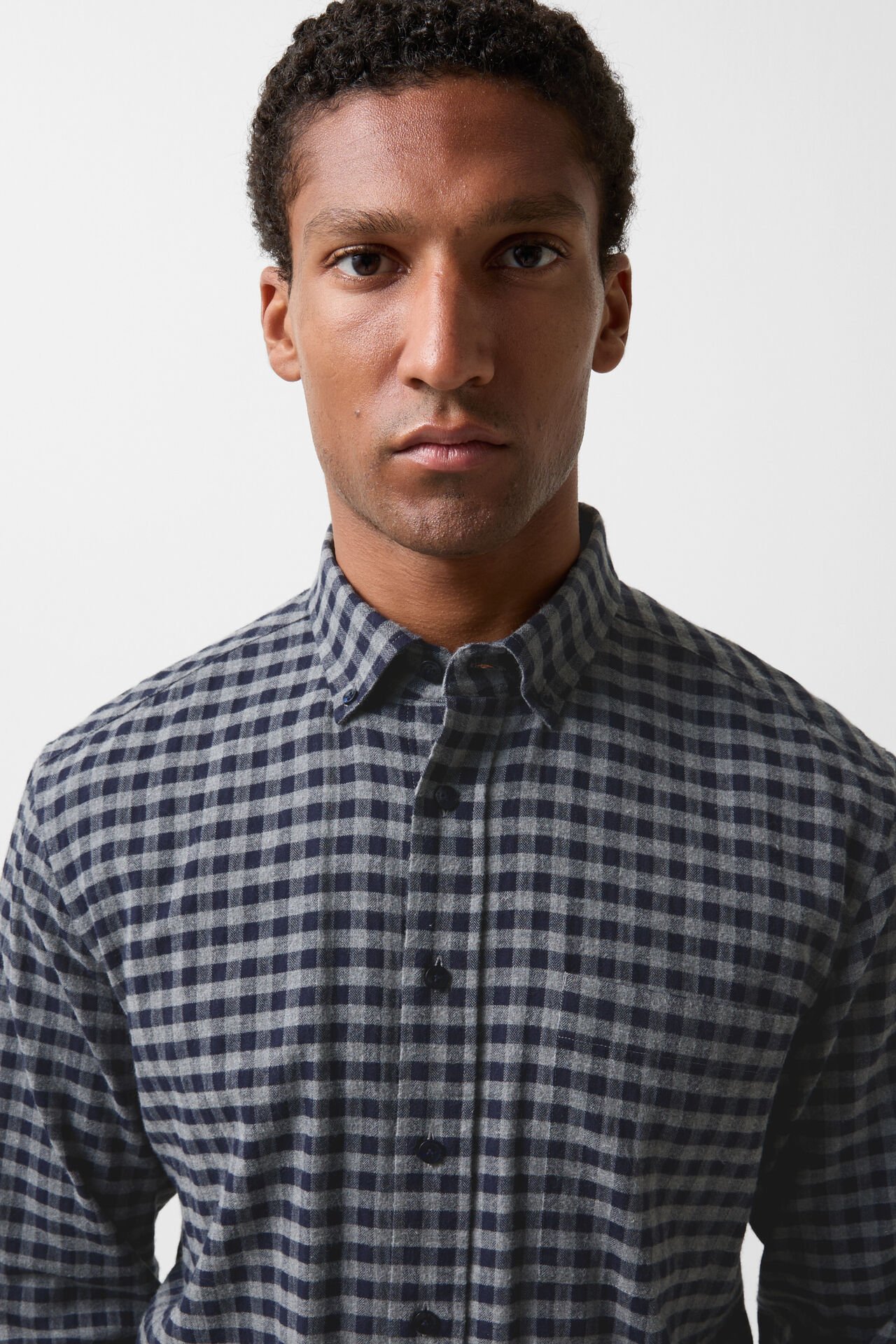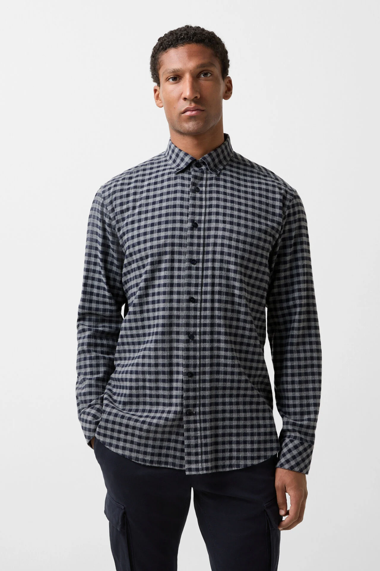 С изискан шахов дизайн и изящна яка с копчета, тази риза оформя тясна и съвършено структурирана раменна линия