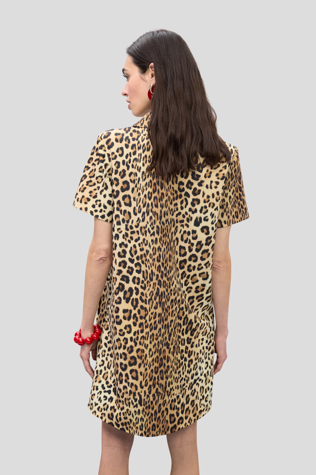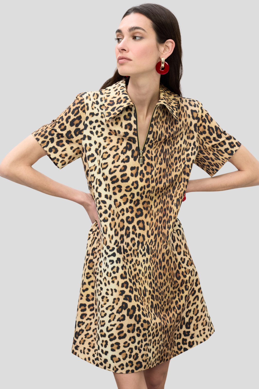Подходяща за смела и модерна визия, роклята разполага с предно закопчаване с цип и къси ръкави