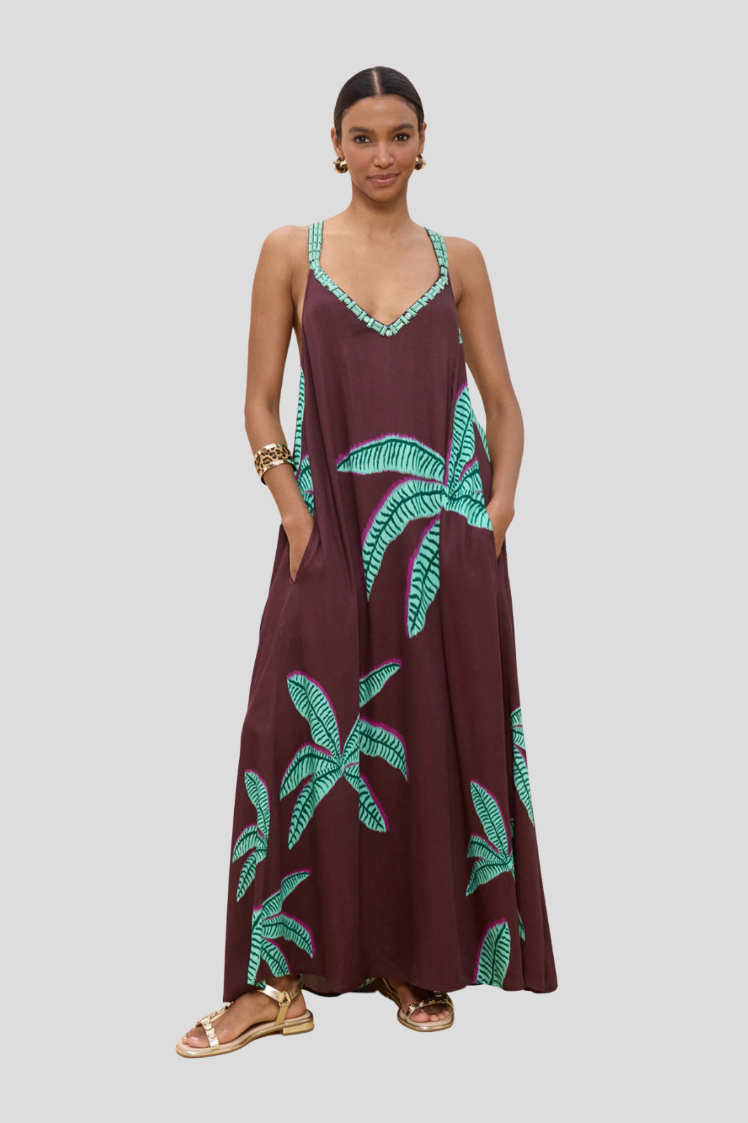 Дълга рокля с дълги презрамки и впечатляващ принт с палмови дървета