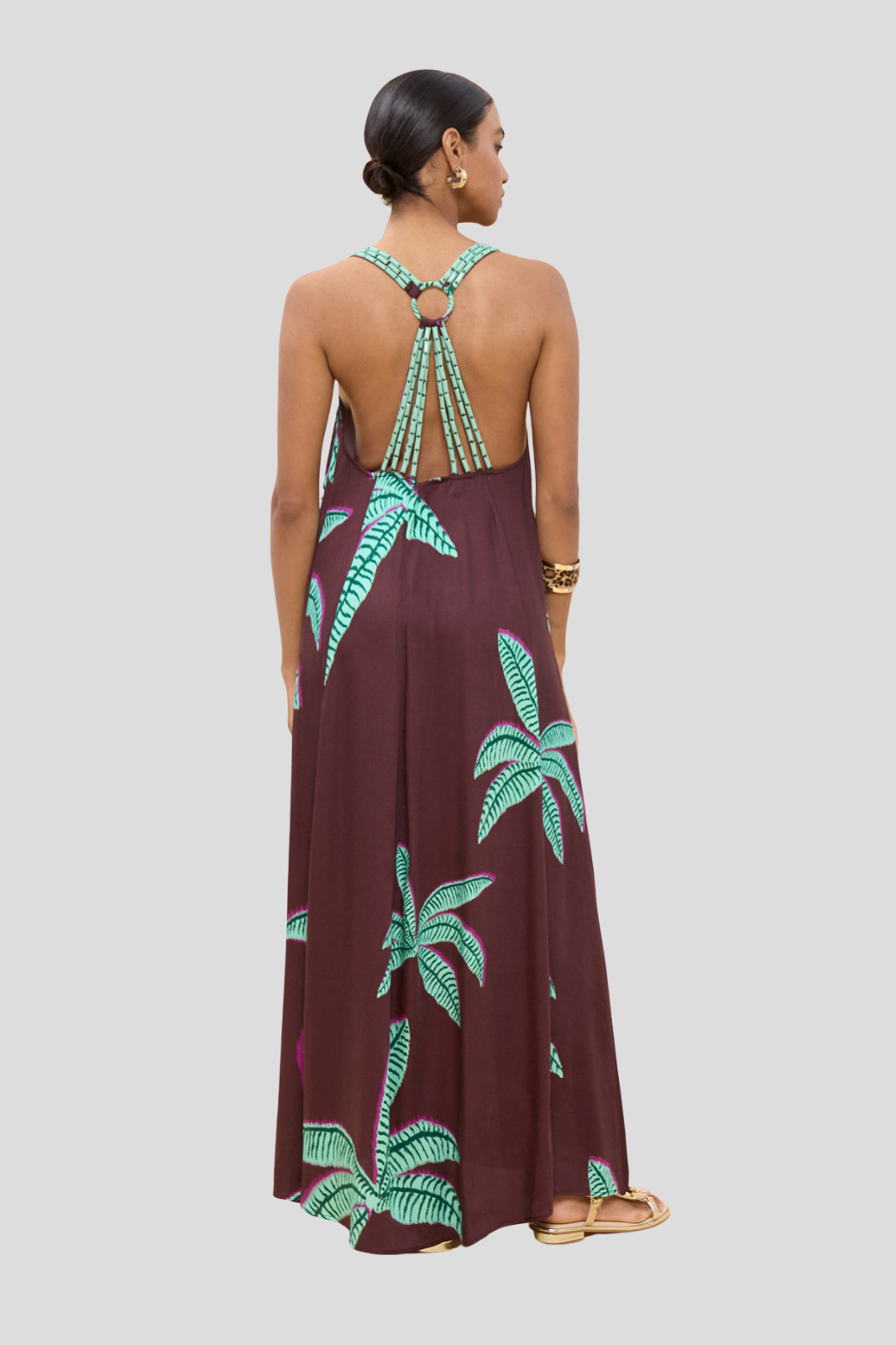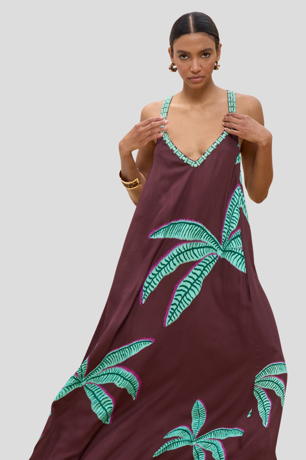 Дълга рокля с дълги презрамки и впечатляващ принт с палмови дървета