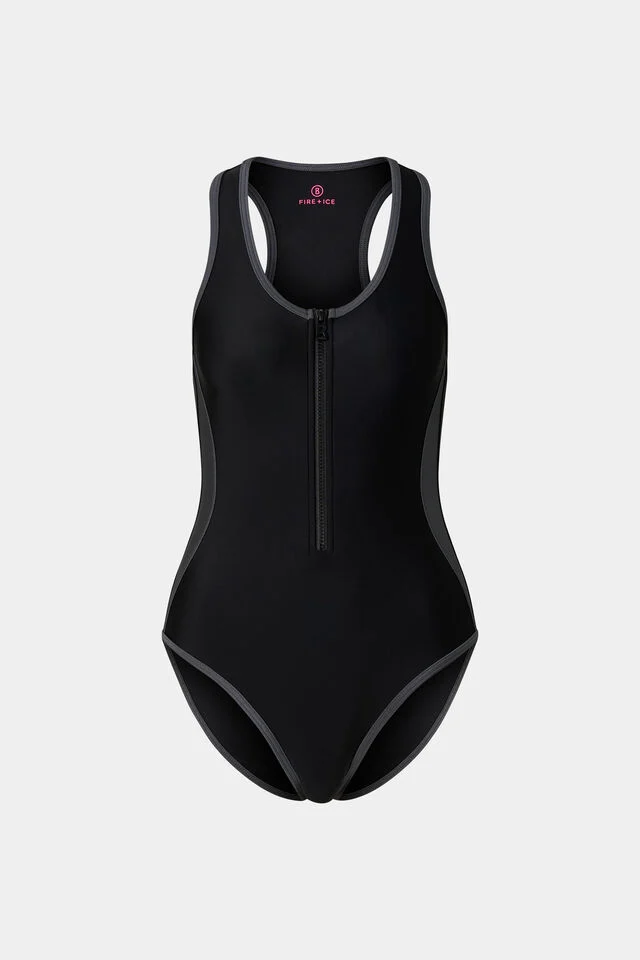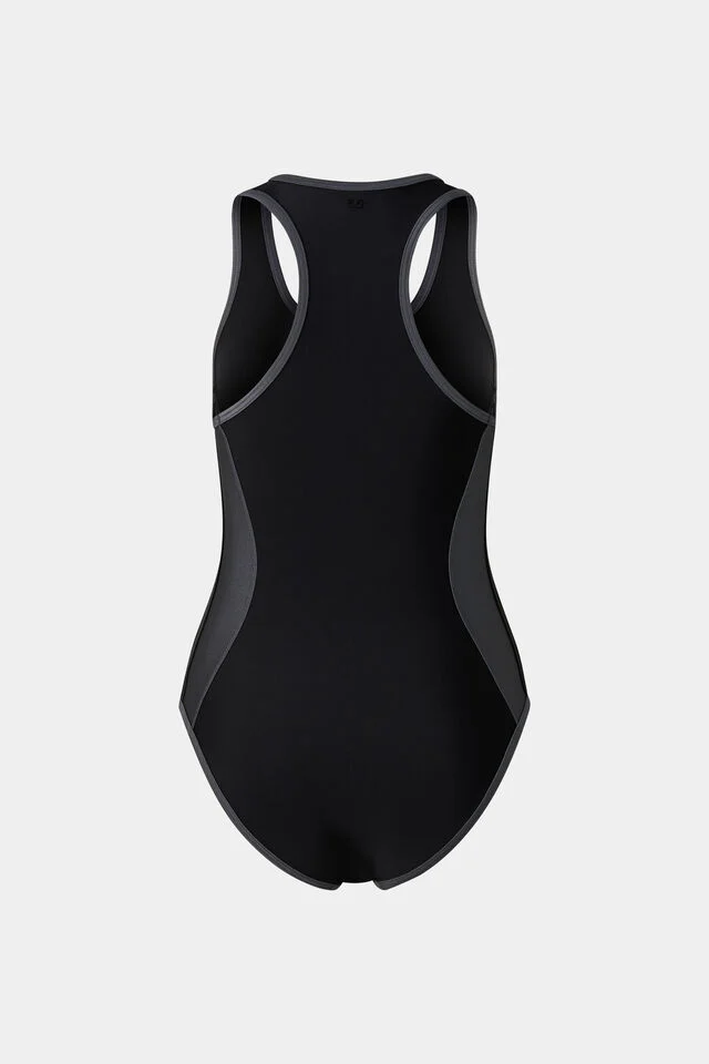 Бански в прав силует с кръстосани детайли, предно закопчаване с B-цип и кръгло деколте